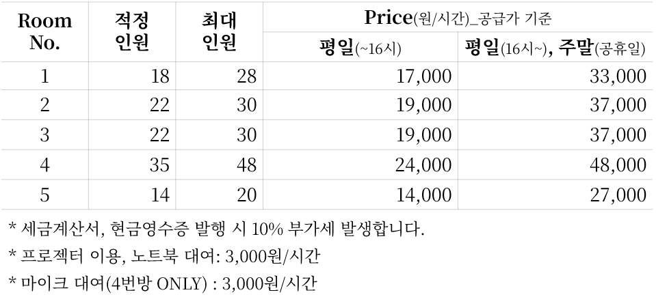 합리적이다 못해 저렴한 공간 이용료와 더불어 강의와 모임을 하는데 한치의 부족함도 없도록 지원하겠습니다.